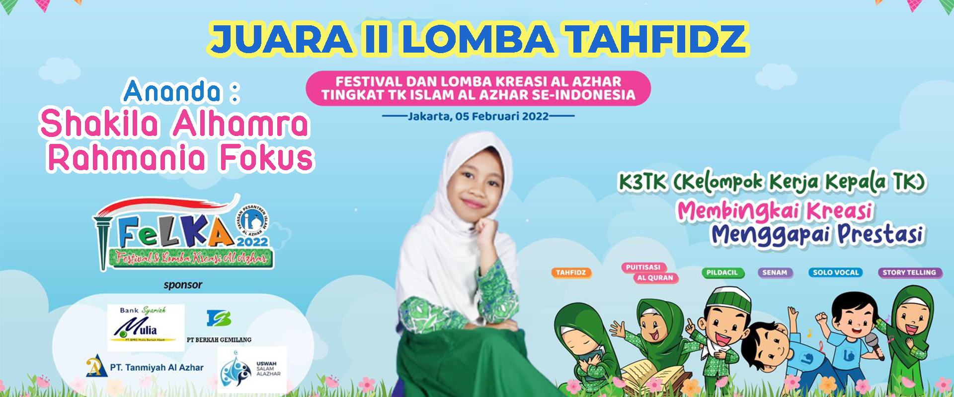 Alhamdulillah saya dan suami sangat senang menyekolahkan anak di KB/TK Islam Al Azhar 11 Kemang Pratama. Azka & Zizi kami sekolahkan disini mulai dr toddler hinggan kelas TK B. Mereka pun sangat nyaman dan senang bersekolah disini, lingkungannya bersih, guru2 nya baik, sabar dan sangat ramah. Setiap kali pulang sekolah selalu bertambah kemampuan anak, semakin banyak hafalan suratnya, semakin pintar kemampuan membaca Al quran dll. Alhamdulillah kami tidak salah pilih memilih KB/TK Al Azhar 11 Kemang Pratama sebagai tempat menimba ilmu anak2 kami.