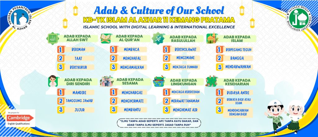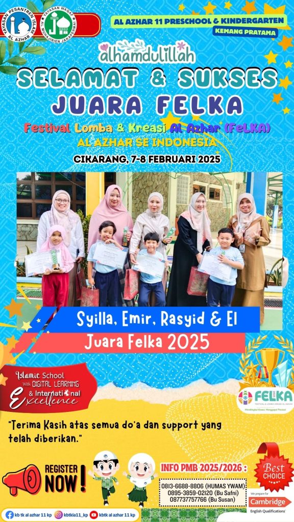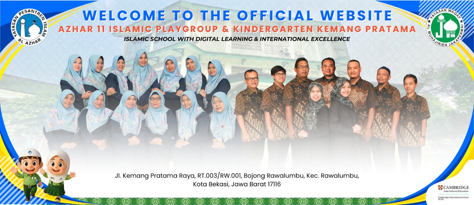 KB-TK Islam Al Azhar 11 Kemang Pratama adalah salah satu sekolah Al Azhar ramah anak untuk anak usia dini di Kota Bekasi. Layanan yang kami selenggarakan mulai dari Toddler (2 tahun), Kelompok Bermain (3 tahun), TK A ( 4 tahun) dan TK B (5 tahun ). Saat ini KB-TK Islam Al Azhar menggunakan Kurikulum Merdeka yang terintegrasi dengan nilai-nilai agama Islam yakni pembiasaan ibadah sehari-hari dan penanaman adab keseharian. Kurikulum Merdeka diimplementasikan melalui kegiatan bermain. Kegiatan bermain dikemas menjadi kegiatan edukatif yang menyenangkan dan dapat mengembangkan berbagai aspek kemampuan dasar yang ada pada anak, sehingga anak akan berkembang menjadi pribadi yang cerdas, aktif, kreatif, mandiri dan berfikir kritis. Nilai-nilai agama Islam yang ditanamkan diperkuat melalui program unggulan Kelas Tahfizh dan Tilawati. Sedangkan untuk mengembangkan bakat dan minatnya dapat dimaksimalkan melalui program ekstrakurikuler seperti menari, menyanyi, melukis, futsal, robotic dan panahan. Untuk penunjang pembelajaran sekolah juga sudah dilengkapi dengan sarana prasarana yang refresentatif seperti playground indoor, halaman bermain yang luas , Pusat sarana Belajar (PSB), Lab Komputer, ruang kelas yang nyaman,menyenangkan dan mengikuti perkembangan zaman. Anak-anak juga akan dibimbing oleh guru-guru berpengalaman yang memiliki standar Pendidikan PAUD dan bersertifikasi. Yuk gabung bersama kami KB-TK.Islam Al Azhar 11 Kemang Pratama, Bersama kami mewujudkan generasi muslim yang bertaqwa, beradab, cerdas, mandiri, berfikir kritis dan berkebhinekaan global !.